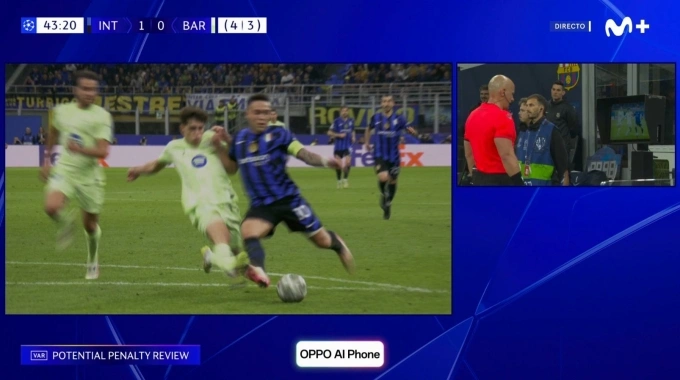 Trong tình huống Pau Cubarsi xoạc bóng cản Lautaro Martinez ở cuối hiệp một,trọng tài Szymon Marciniak ban đầu xua tay cho rằng Cubarsi xoạc bóng hợp lệ. Nhưng ông đổi quyết định khi được tổ VAR tư vấn.