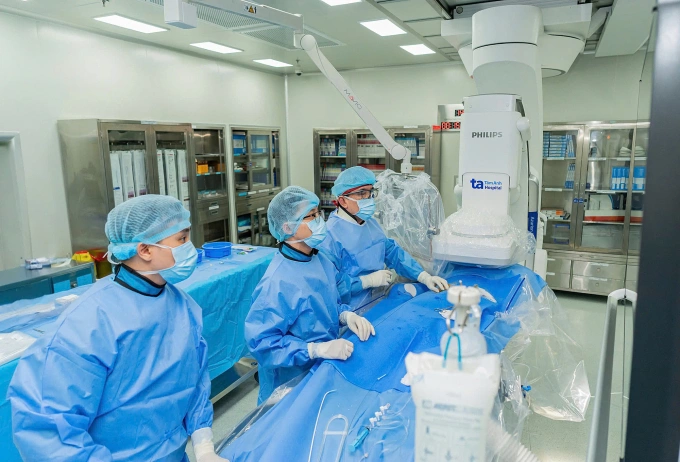 Bác sĩ Trung tâm Tim mạch Can thiệp đặt stent cho ông Tuấn tại phòng DSA. Ảnh: Bệnh viện Đa khoa Tâm Anh