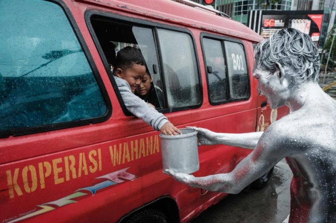 Ari Munandar (phải),với cơ thể được sơn màu bạc,nhận tiền boa tại một ngã tư ở Jakarta. ẢNH: AFP