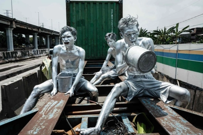 Sau buổi biểu diễn,cả nhóm về khu ổ chuột ven sông bằng xe tuk-tuk,xa những tòa nhà cao tầng của thủ đô Jakarta. Ari quay lại giếng nước trước nhà,bê xô nước lạnh để rửa lớp sơn kim loại bám trên cơ thể. Cô con gái một tuổi,Arisya,đứng nhìn cha với đôi mắt to tròn.