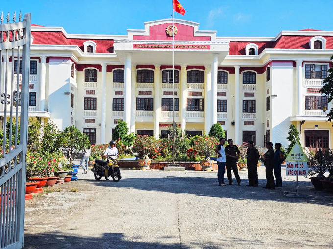 Lực lượng an ninh cơ sở trực tại sân tòa,sáng 8/4. Ảnh: Nam An