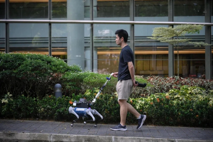 Nghiên cứu sinh Cai Shaojun đi bộ cùng chó robot dẫn đường cho người khiếm thị ở Singapore. Ảnh: ST