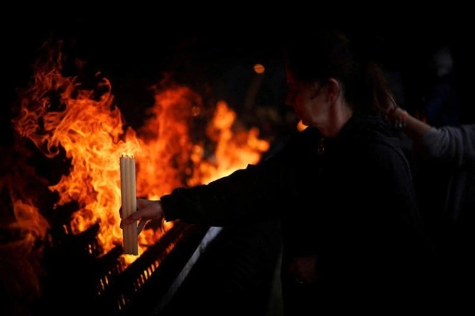 Một tín đồ thực hiện nghi lễ ném cây nến vào đống lửa để thực hiện lời khấn hứa với Đức Mẹ Maria. Ảnh: Reuters