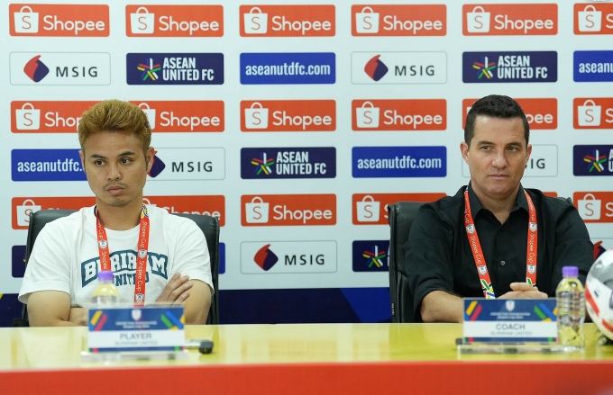 Theerathon Bunmathan (trái) và HLV Osmar Loss dự họp báo vào trưa ngày 13/5,một ngày trước trận Buriram United gặp Công an Hà Nội ở chung kết Cup CLB Đông Nam Á 2024-2025 tại sân Hàng Đẫy. Ảnh: CAHN