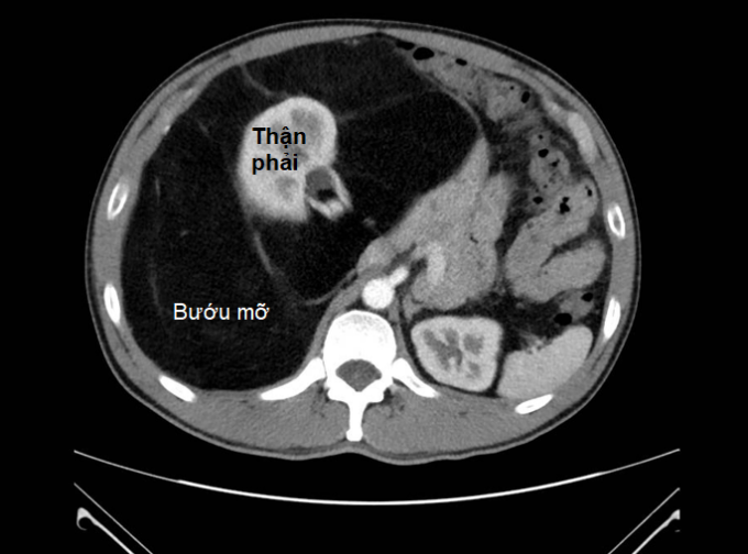 CT bụng cho thấy bướu choán toàn ổ bụng,thận phải đã bị bướu mỡ bao xung quanh. Ảnh: Bệnh viện cung cấp