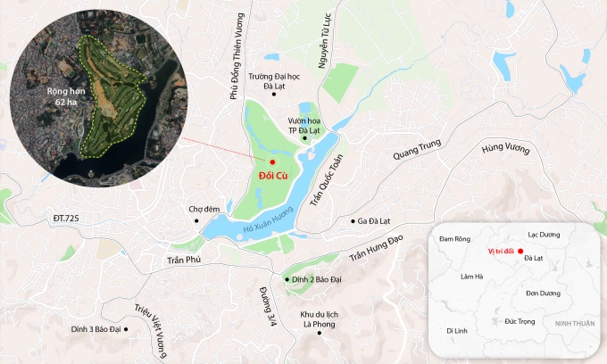 Vị trí đồi Cù ở trung tâm TP Đà Lạt. Đồ họa:Đăng Hiếu