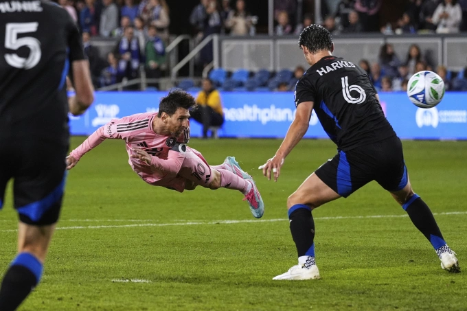 Lionel Messi bay người đánh đầu trong trận Inter Miami hòa chủ nhà San Jose Earthquakes 3-3 ở vòng 13 MLS trên sân San Jose,California,Mỹ ngày 15/5. Ảnh: AP