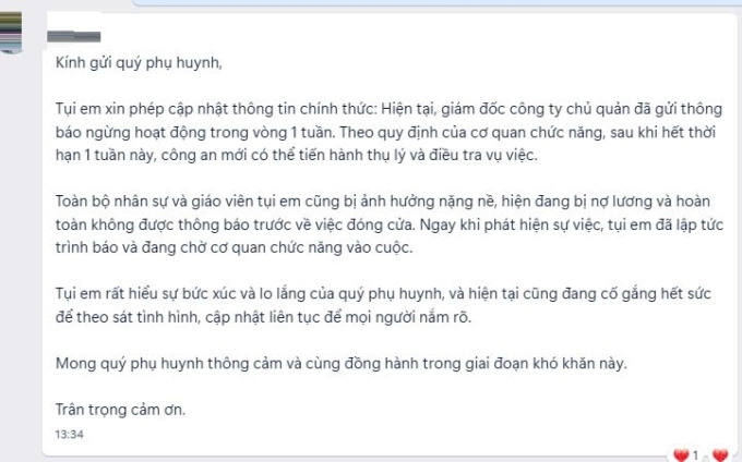 Anh kể đã đóng gói học phí 3 năm cho con,giá 30 triệu đồng sau khi được giảm 45%,hồi đầu tháng 4. Ngày 8/5,trung tâm thông báo tạm đóng cửa một tuần đến ngày 14/5 để sửa chữa sau trận mưa lớn nhưng đến nay không mở lại.