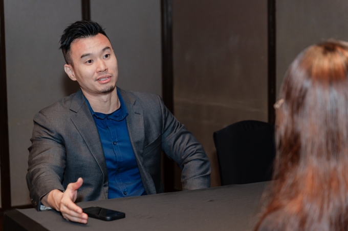 Ông Tey tư vấn trực tiếp 1-1 về chương trình học thạc sĩ giảng dạy cho khách tham dự tại sự kiện. Ảnh: NUS