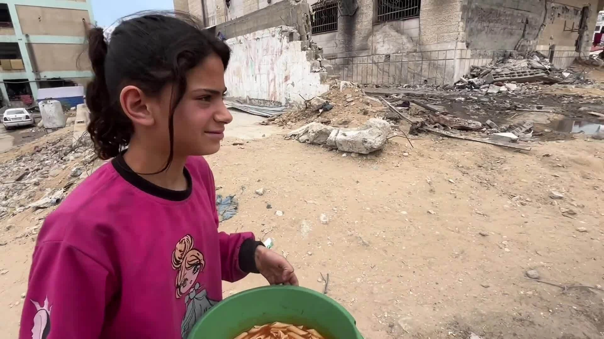 Jana nhận được một bữa ăn từ bếp cộng đồng và mang về chia sẻ với anh chị em trong nhà. Video: CNN