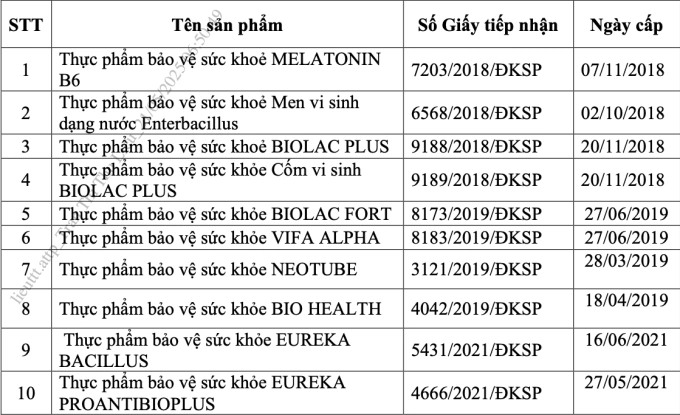 Danh sách thu hồi gồm Men vi sinh dạng nước Enterbacillus,cốm vi sinh BIOLAC PLUS,MELATONINB6,BIOLAC FORT,NEOTUBE... Công ty này chủ động xin rút hồ sơ liên quan các sản phẩm trên từ đầu tháng 5.