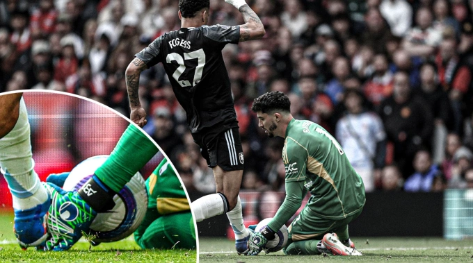 Morgan Rogers tranh bóng với thủ thành Altay Bayindir rồi ghi bàn vào lưới trống,nhưng không được công nhận,trong trận Aston Villa thua Man Utd 0-2 trên sân Old Trafford,thành phố Manchester,Vương quốc Anh,vòng 38 Ngoại hạng Anh ngày 25/5/2025. Ảnh: Sky Sports