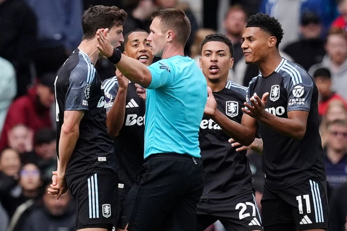 Các cầu thủ Aston Villa phản ứng với trọng tài Thomas Bramall. Ảnh: PA