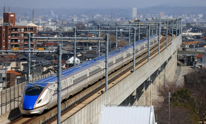 Đoàn tàu cao tốc di chuyển qua thành phố Hakusan,tỉnh Ishikawa,Nhật Bản,hôm 16/3/2024. Ảnh: AFP