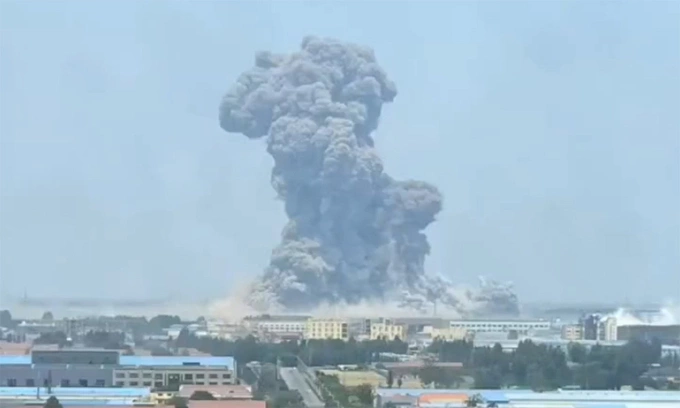 Khói bốc lên từ vụ nổ nhà máy hóa chất ở tỉnh Sơn Đông,Trung Quốc,ngày 27/5. Ảnh: Paper