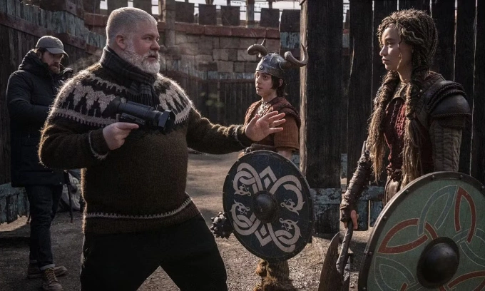 Đạo diễn Dean DeBlois (thứ hai từ trái qua) chỉ đạo diễn xuất cho diễn viên trên phim trường "Bí kíp luyện rồng". Ảnh: Universal Pictures