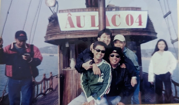 Joel mặc áo xanh,đỏ cùng đồng nghiệp trên tàu Âu Lạc 04 ở Hạ Long. Ảnh: NVCC