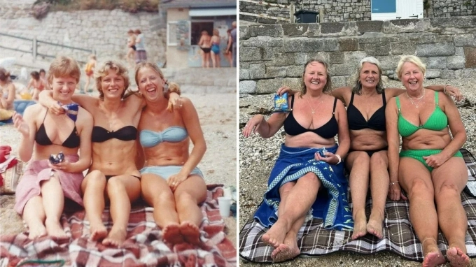 Trên thế giới,nhiều người cũng thích chụp lại bức ảnh tại cùng địa điểm sau hàng chục năm. Một trường hợp nổi tiếng là ba chị em người Anh,ngoài 60 tuổi - Pamela Cook,Tracey Waygood và Elaine McCartney. Vào tháng 1/2025,họ đã cùng nhau tái hiện bức ảnh trên bãi biển Castle ở Cornwall,Anh. Để làm được điều này,cả ba đã mất nhiều thời gian để chuẩn bị các đồ vật tương đồng với ảnh cũ như áo tắm,khăn,gói đồ ăn nhẹ.