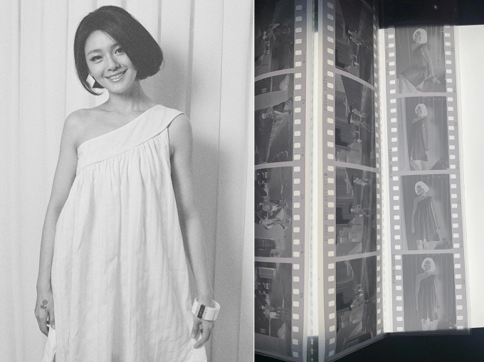 Nhiếp ảnh gia chụp bằng máy ảnh Canon EOS 5 kết hợp film Kodak Tri-X 400. Hy Viên mặc váy trắng lệch vai,tóc ngắn,luôn mỉm cười trước ống kính.