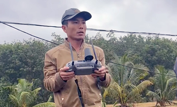 Đăk Lăk- Nghe tin có người mắc kẹt giữa dòng nước xiết ở xã Ea Ô, anh Hoàng Văn Thiện mang chiếc drone nông nghiệp của gia đình bay ra thả phao, cẩu nạn nhân vào bờ, sáng 21/11.